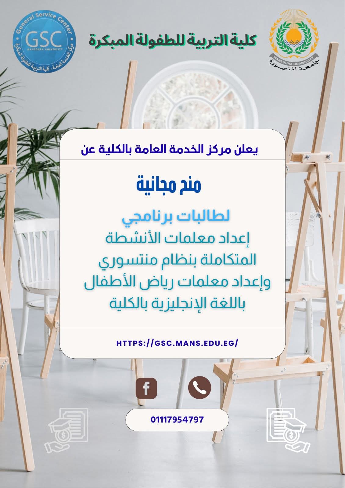 يسر إدارة مركز الخدمة العامة بالكلية أن تعلن عن تقديم منح تدريبية مجانية لمدة عام كامل، لطالبات البرنامجين: (إعداد معلمات الأنشطة المتكاملة بنظام منتسوري)، و(إعداد معلمات رياض الأطفال باللغة الإنجليزية) بالكلية بهدف تنمية مهاراتهن وتطوير قدراتهن المهنية.